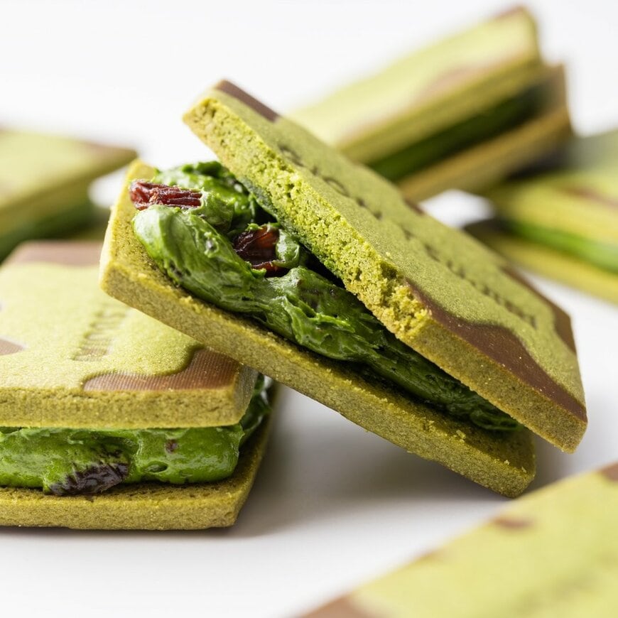 クリームとラムレーズンは抹茶を練り込んだソフトクッキーで挟まれています。ひと口かじるとクッキーはほろりと崩れ、クリームとともにとろけて口の中に奥深い美味しさが広がります。