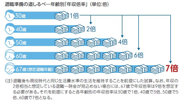 現役世代が退職する頃には退職年齢は67歳にまで高まっていると想定して、その時点の年収の7倍が必要と想定しました(このほか、年収の2倍の退職一時金を受け取ることを前提としています)。