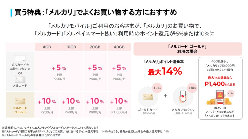 ポイントは、メルカード ゴールドで支払った場合はプラスされる還元率が2倍になるということです。10GBプランより上のプランであれば還元上限もアップしています。