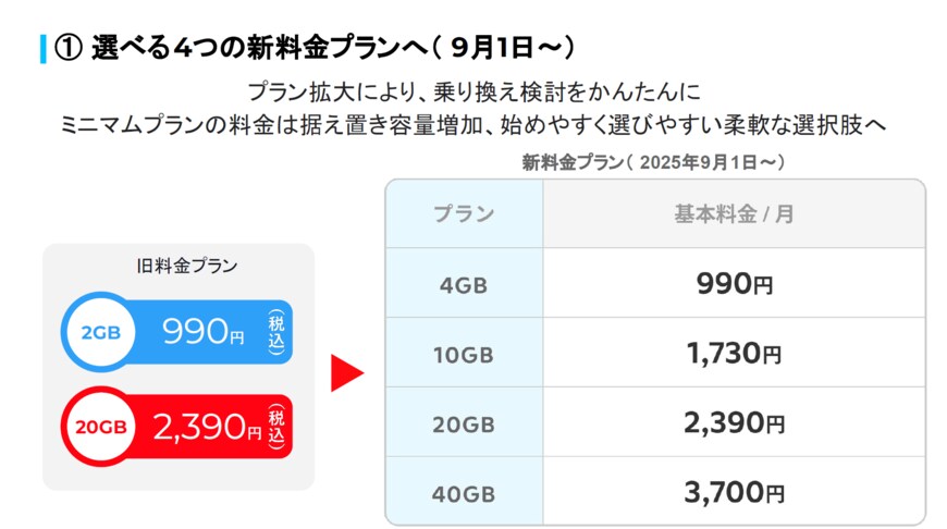 ポイントは旧料金プランの2GBプランと同じ価格で4GBプランを提供する点です。あまりデータ容量を必要としない人やギガを買うことで無駄なく使いたい人にとって、より選択しやすいプランとなっています。