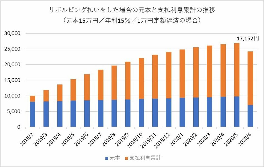 一方、リボ払いで毎月1万円の元利定額返済をセットしているなら、金利は合計17,152円になった上、支払期間は17か月になります(元本部分の返済が1万円に満たないため、返済期間が15カ月以上に延びます)。