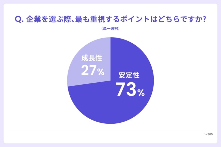 「企業を選ぶ際、最も重視するポイントはどちらですか?」という質問に対しては、73%が「安定性」、27%が「成長性」と回答しました。