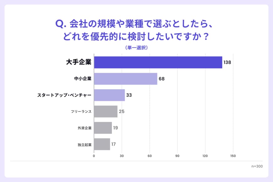 また「会社の規模や業種で選ぶとしたら、どれを優先的に検討したいですか?」という質問では「大手企業」が138人と最も多く、次いで「中小企業」が68人という結果でした。