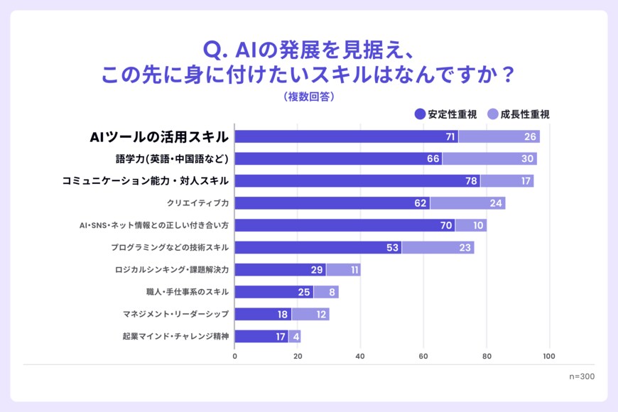 内訳をみると「AIツールの活用スキル」では安定性重視の学生71人、成長性重視の学生26人の計97人、「語学力」では安定性重視の学生66人、成長性重視の学生30人の計96人、「コミュニケーション能力・対人スキル」では安定性重視の学生78人、成長性重視の学生17人の計95人が票を入れています。