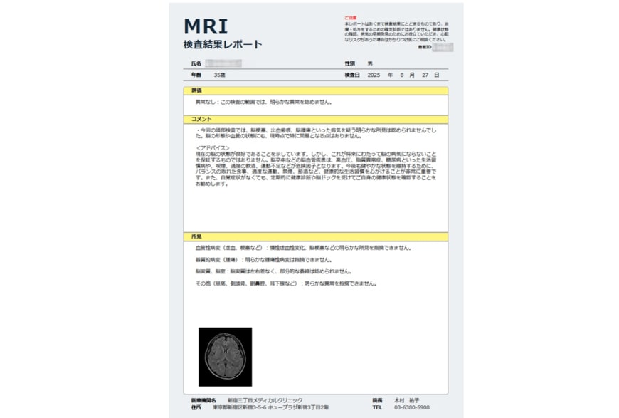 検査結果レポートには、所見の有無・アドバイスを含む、医師からのコメント・症状ごとの所見が詳細に記載されています。今回は「異常なし」ということで、いずれの所見もありませんでしたが、「頭部のMRI検査を実施すると、こういうことが分かるんだ」という気づきを得ることができました。