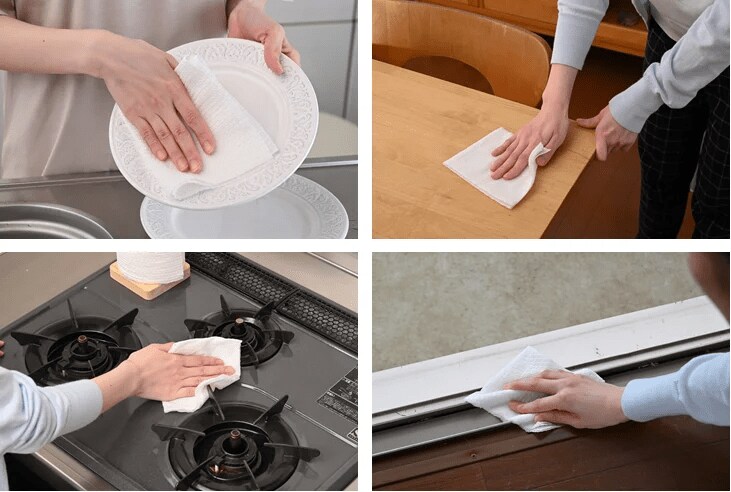 ガスコンロやワークトップなどキッチンの清掃はもちろん、ほこりがたまりがちなテレビ台や窓のサッシなどの掃除にも大活躍。汚れたらそのまま廃棄できるので、洗濯の手間を気にせず手軽に使用できるのもうれしいポイントです。