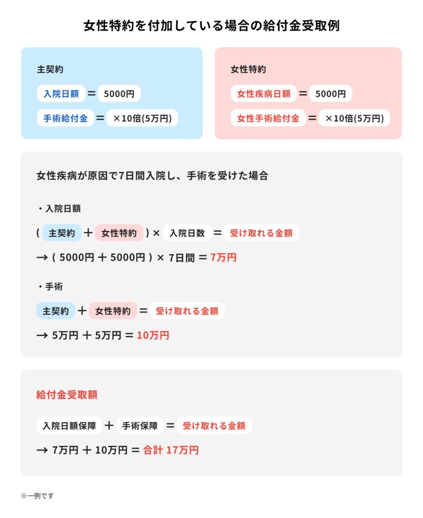 女性特約では、対象疾患での入院時に主契約の入院日額に加えて、同額程度の追加給付金を受け取れるのが一般的です。例えば主契約が日額5000円なら、女性特約でさらに5000円が上乗せされ、合計1万円の受給が可能です。