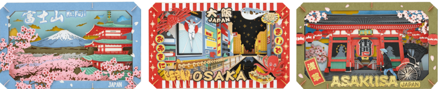 「富士山と桜」は、山梨県の桜の名所でミシュラン・グリーンガイド表紙でも有名な新倉山浅間公園を、「大阪」は金色の紙で文字を飾り、大阪名物を散りばめてにぎやかさを表現。「浅草」では雷門を主役に、ペーパーシアターならではの奥行きで迫力を演出しています。