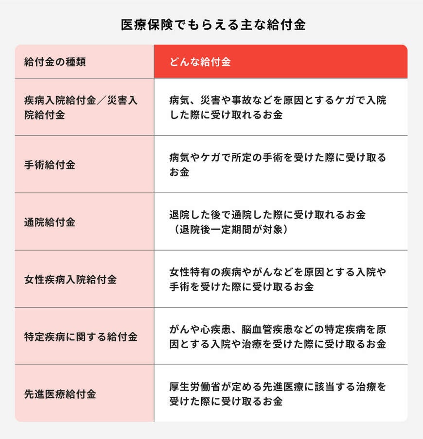 「がん保険」「三大疾病保険」「八大疾病保険」は文字通りそれぞれの病気に対して備えられる保険で、診断確定や入院・手術など所定の条件に該当した際に、一時金が受け取れる保障が一般的です。