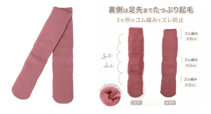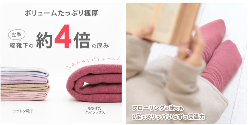 通常のコットン靴下と比較して、もちはだ ハイソックスの厚みは約4倍あります。外側はしっかりとした作りですが、内側はふわふわの起毛がぎっしりと詰まっており、まるで履く毛布のようなボリューム感があります。