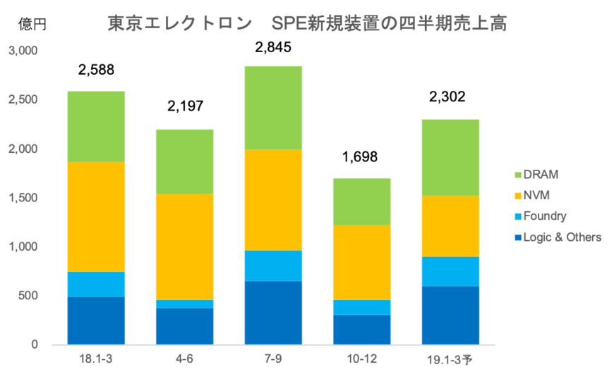 TELの18年度第3四半期(18年4~12月)業績のうち、主力のSPE(半導体製造装置)部門は、売上高が前年同期比20%増の8779億円となった。18年10月の第2四半期決算時に通期業績の下方修正を行っており、SPE部門は当初の1兆2880億円から1兆1698億円に見直された。第3四半期の四半期ベースでのSPEの新規装置売上高は、前四半期比40%減の1698億円と大きな落ち込みとなったが、メモリー投資の減少に加え、大手ロジック顧客の売り上げが第2四半期に前倒しで計上されたことによる反動減もあったという。
