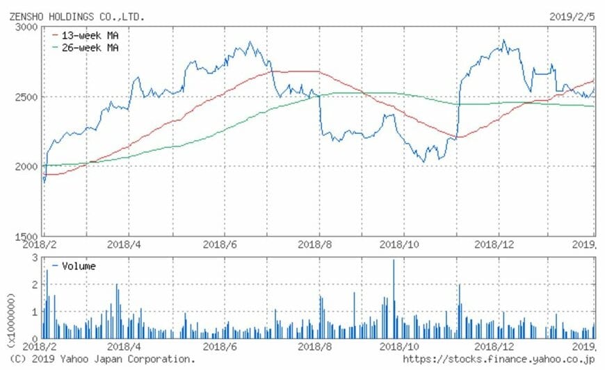同社株価は12月7日に2,934円の天井を付けた後に下落を始め、12月下旬に2,500円台にまで下落。その後は、いったんリバウンドして2,700円台を回復したものの、再度1月に2,500円台まで下落して値動きが停滞中。次の値動きが生じるのを待っている状態です。