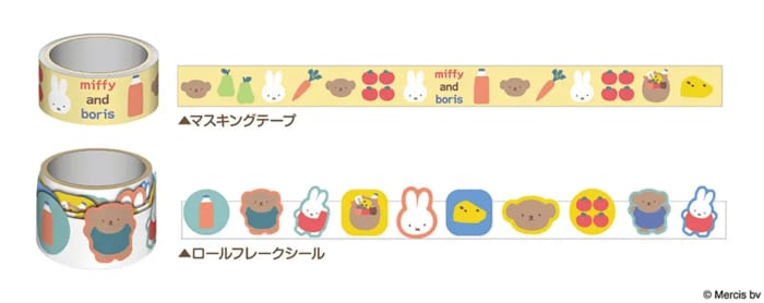郵便局限定で登場した「ミッフィー/マスキングテープ&ロールフレークシールセット」。ミッフィーと仲間たちが描かれたポップでキュートなデザインが魅力です。