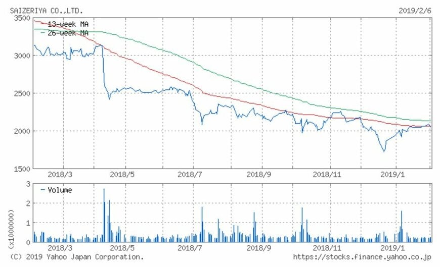 同社株価は2018年1月の3,800円台から下落トレンドが始まり、12月に1,696円の安値に到達。その後1月に2,000円台を回復し、2,000円前後の落ち着いた値動きが1月中旬以降継続している状態です。