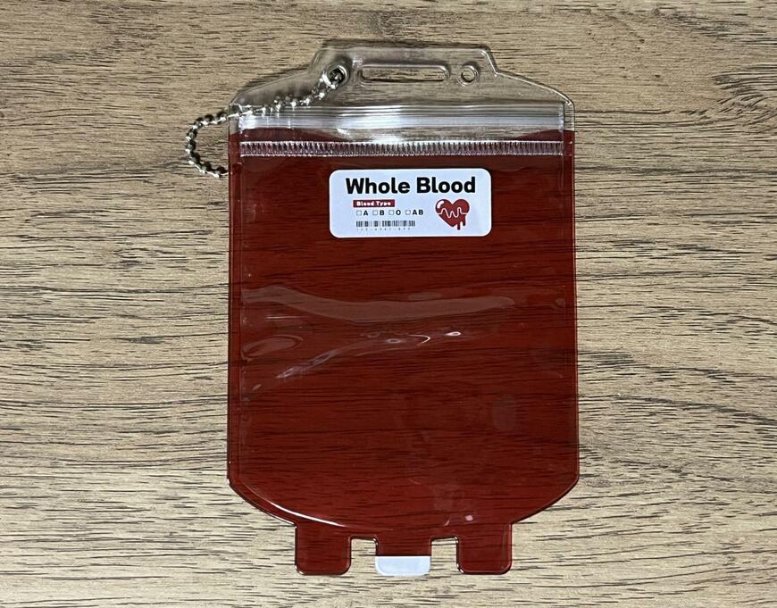 血液型のチェック表やバーコードもついています。本物の輸血パックにそっくりなデザインですね。