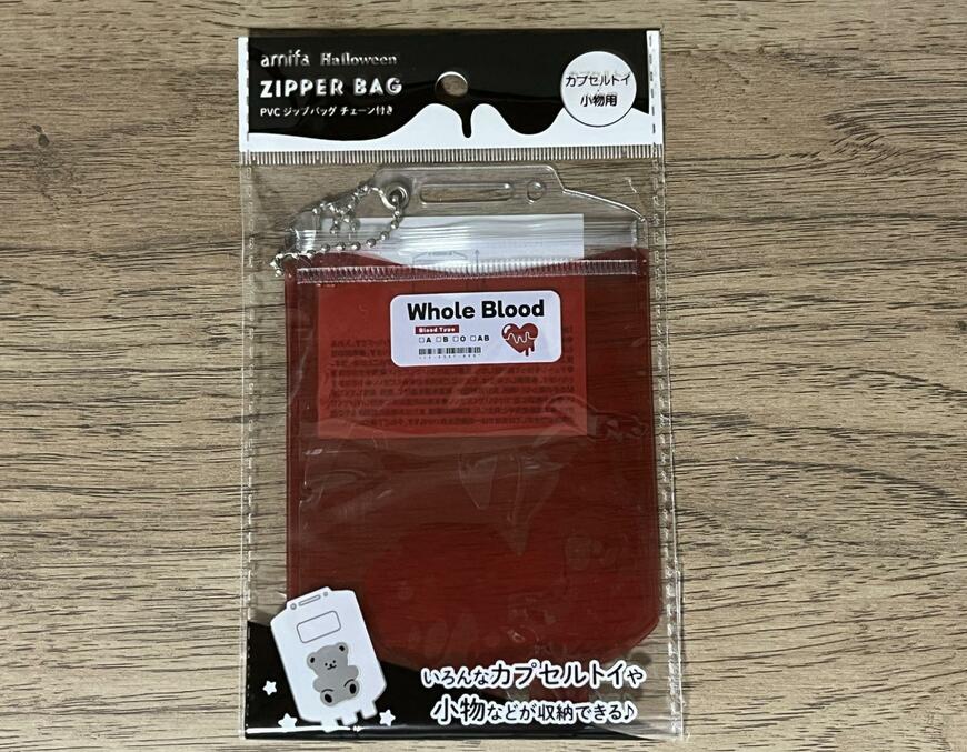 こちらがセリアで購入できる「輸血パックデザインのジップバッグ」です。