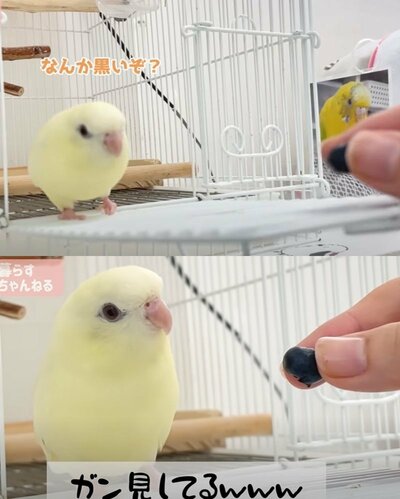 動画に登場しているのは、サザナミインコの「おもち」ちゃん。おもちちゃんの前に、@anz_omomiriさんはブルーベリーを差し出します。