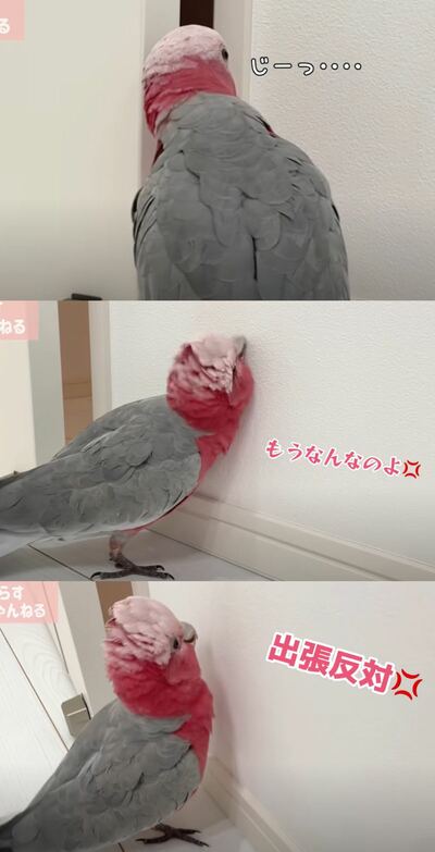パパさんが帰ってこないかと、ドアの隙間を覗き込むみりんちゃん。@anz_omomiriさんが「おいでこっち」と声をかけますが、みりんちゃんは壁に頭やくちばしをこすりつけます。