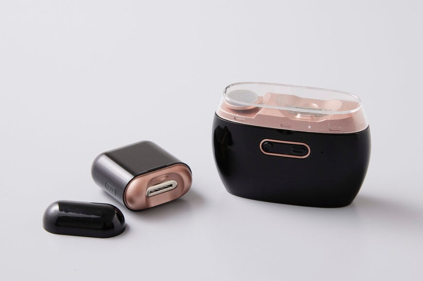 完全ワイヤレスイヤホンのケースのような形状で、カラーはブラックとピンクゴールドの2色で構成されています。ピンクゴールドは、爪をケアする刃ややすり部分が備わったユニットやボタンの周辺に配色されており、ちょうどよいアクセントになっています。