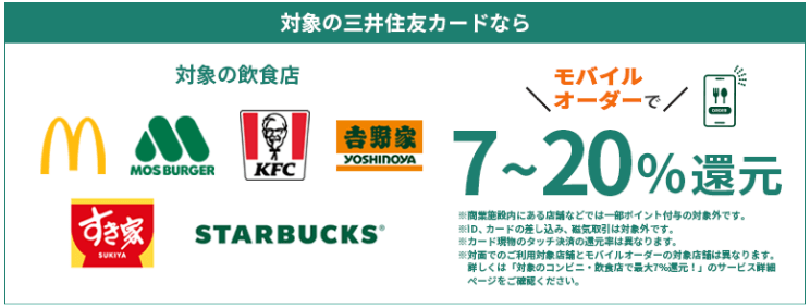 1. 【三井住友カード】モバイルオーダーを使うと最大20%還元!