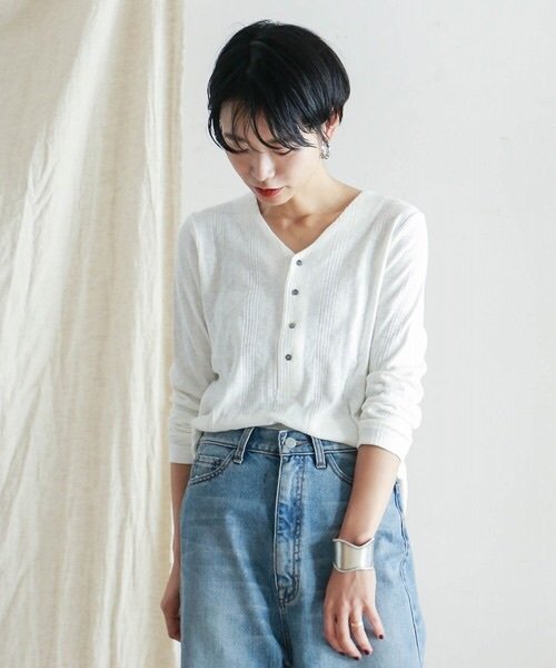 リバイバルコットン生地を使用したヴィンテージライクなチュニック。ヘンリーネックも相まって古着っぽいけど、肩の落ちるデザインと女性らしい丈感で今っぽく着こなせます。