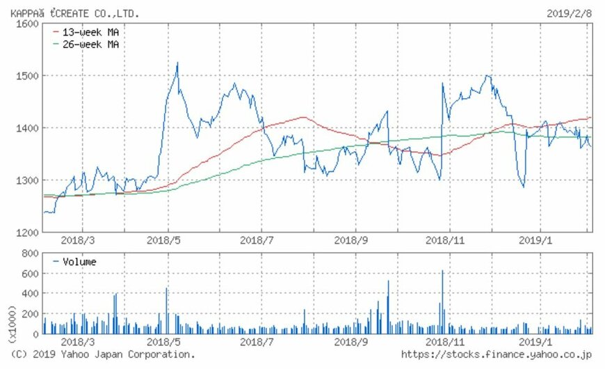 同社の株価は上限1,500円付近、下限1,250~1,300円付近でのレンジ相場が継続中です。12月後半に1,264円まで下落しましたが、その後株価は回復し、1,350~1,400円付近の狭い範囲での値動きが1月以降継続しています。