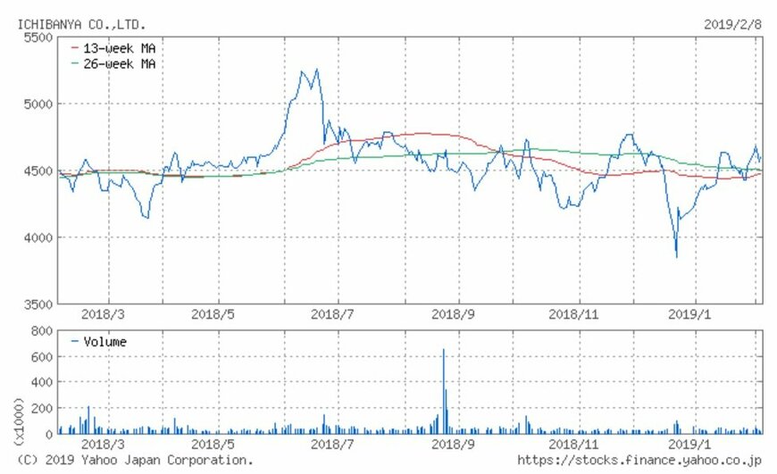 同社の株価は6月の5,300円を天井に下落しました。12月には3,815円にまで下落して安値を更新したものの、1月には回復。現在は4,500円付近での狭い値動きが継続しています。