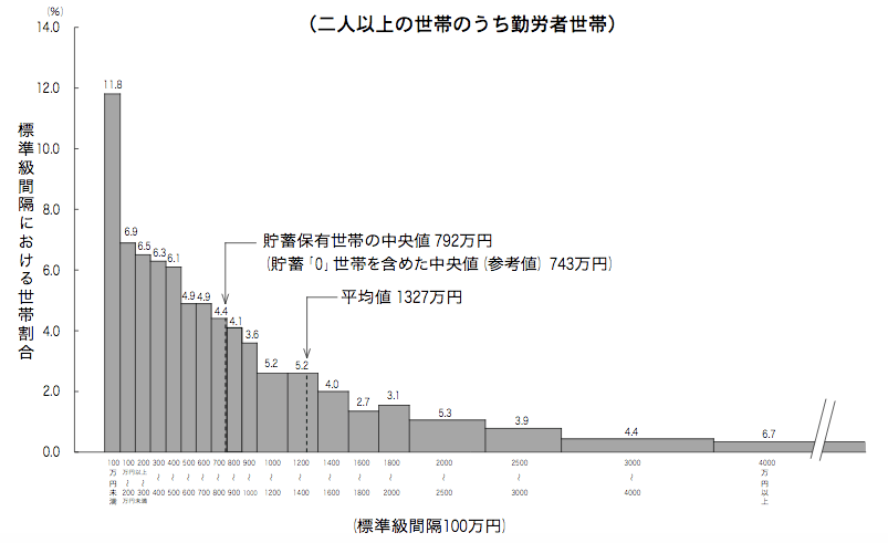総務省が2018年5月19日に発表した「家計調査報告(貯蓄・負債編)平成29年(2017年)平均結果(二人以上の世帯)」のうち、勤労者世帯(二人以上の世帯に占める割合50.9%)の貯蓄額の分布を見てみましょう。