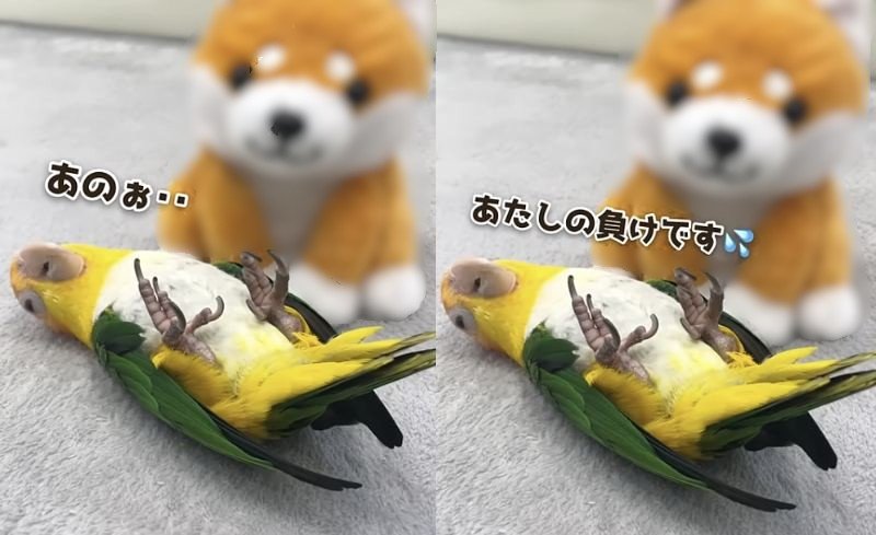仰向けになっておなかを見せたまま動かないとろろちゃん。「あのぉ…」「あたしの負けです」と動画に付けられた字幕は、今にもとろろちゃんの声となって聞こえてきそうです。
