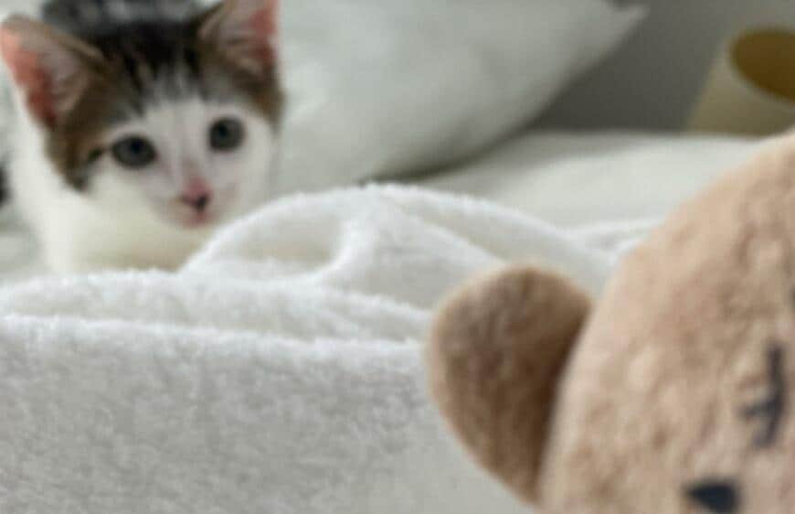 クマのおもちゃを狙う猫ちゃんがXで注目を集めています。投稿したのは、Xユーザーの「@Saeroyi_cat」さんです。