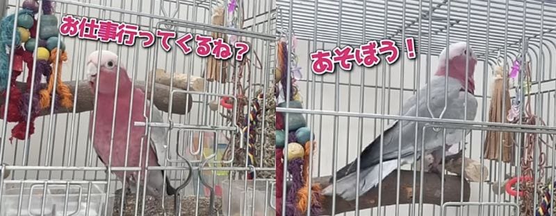 動画に登場しているのは、モモイロインコの「みりん」ちゃん。ケージの中で楽しそうにおしゃべりしています。