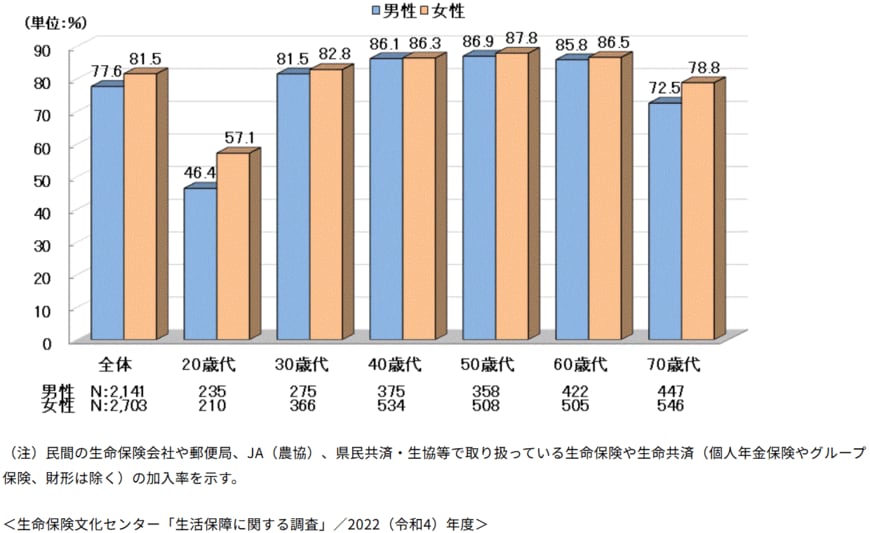 50代の生命保険加入率は男性86.9%、女性87.8%と全年代で最も高くなっています。これは健康リスクの高まりに加え、家族への責任感の強さを反映した結果といえるでしょう。