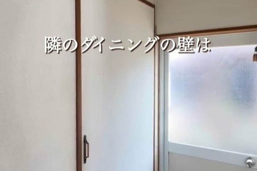 今回の動画では、ダイニングの壁を塗り直して、まるで新築のように仕上げていきます。変身前のダイニングの壁はシミや汚れが酷く、リフォーム済みのキッチンと比べても古さが目立つ様子。