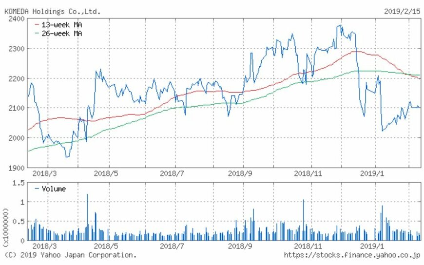 2018年は、上昇トレンドの中で10月以降は高値2,400円が意識される値動きになりました。しかし12月後半に下落し、一時2,006円までになりました。その後は徐々に上昇し、現在は2,100円前後の取引が継続しています。