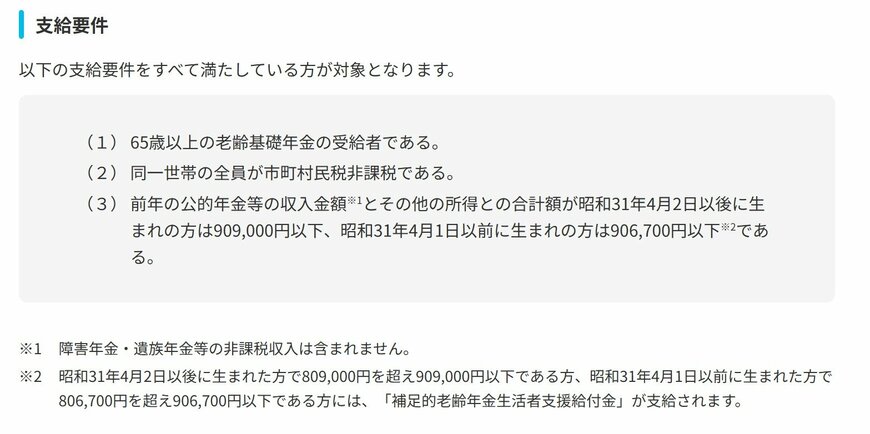 ※2 昭和31年4月2日以後に生まれた方で809,000円を超え90万9000円以下である方、昭和31年4月1日以前に生まれた方で80万6700円を超え90万6700円以下である方には、「補足的老齢年金生活者支援給付金」が支給される