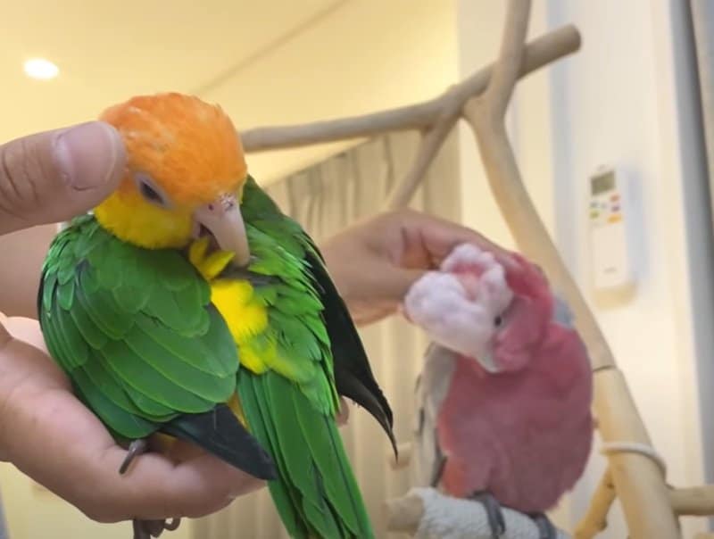 動画に登場しているのは、モモイロインコの「みりん」ちゃんと、シロハラインコの「とろろ」ちゃん。夜の放鳥タイムのようですが、みりんちゃんもとろろちゃんもパパさんのもとでまったりしています。
