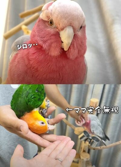 どうやら、みりんちゃんは運動したくない様子。とろろちゃんも飛ぶ様子はなく、パパさんの手に甘えています。