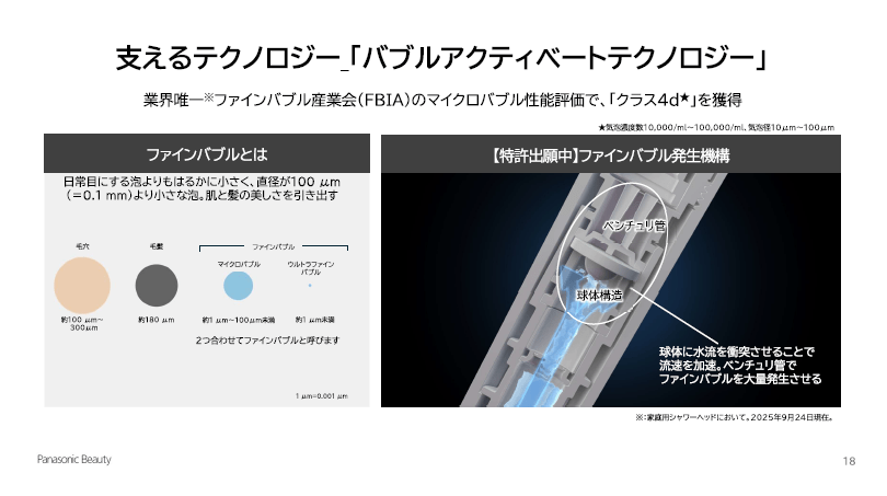 それぞれのモードでカギになるのが、ヘッドの中に球体構造の機構を水流に衝突させ、その先のベンチュリ管でファインバブル(0.1mm以下の空気の泡)を発生させる「バブルアクティベートテクノロジー」と呼ばれる独自技術です。