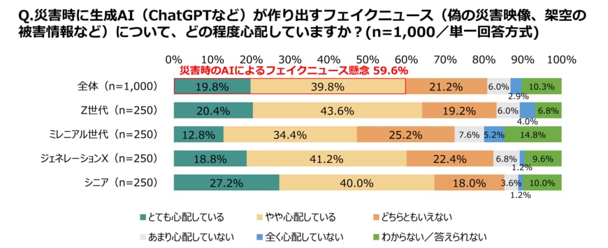 Z世代は、災害時に生成AIが作り出すフェイクニュース(偽の災害映像、架空の被害情報など)に対して、他の世代に比べて最も高い懸念を抱いています。