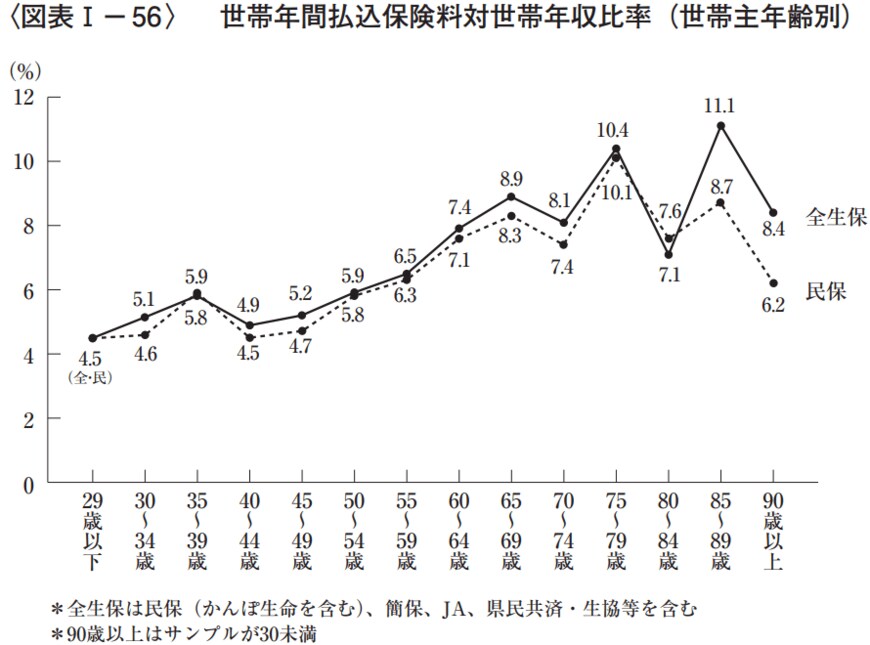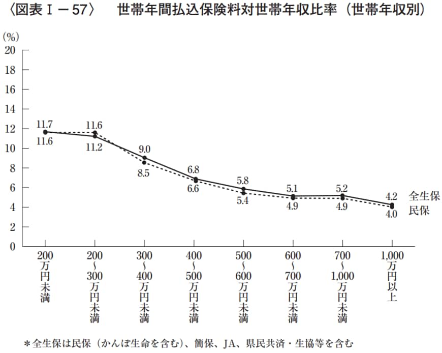 世帯年収別の保険料対年収比率を見ると、40代前半で4.9%、40代後半で5.2%が平均的な水準です。年収1000万円以上の世帯では年間57万9000円(月額約4万8000円)の保険料を支払っている一方、年収に対する比率は4.0%程度に留まっています。