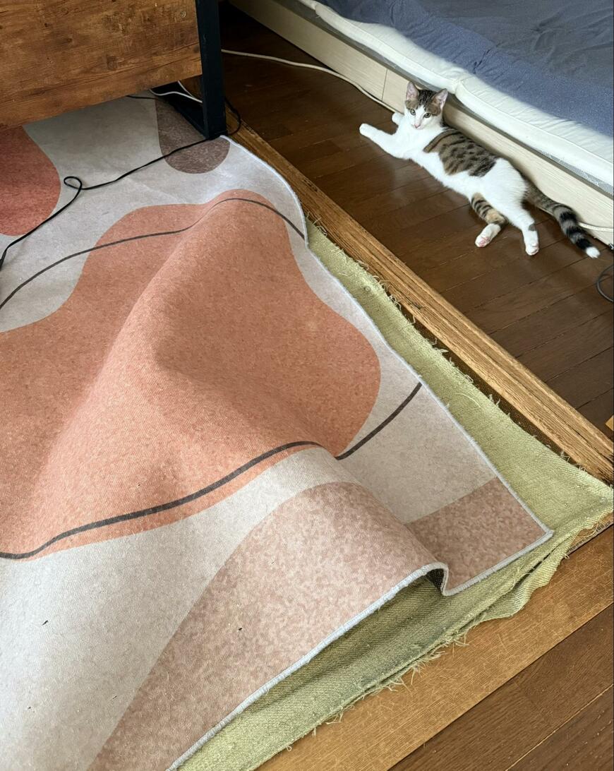 猫がいそうなカーペットを踏まないようにしていた飼い主さんのエピソードがXで注目を集めています。投稿したのは、Xユーザーの「@00shitemita」さんです。