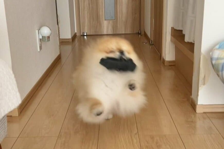 そこに収められていたのは、靴下を咥えて全力で走ってくるポメラニアンの秋田くんでした。