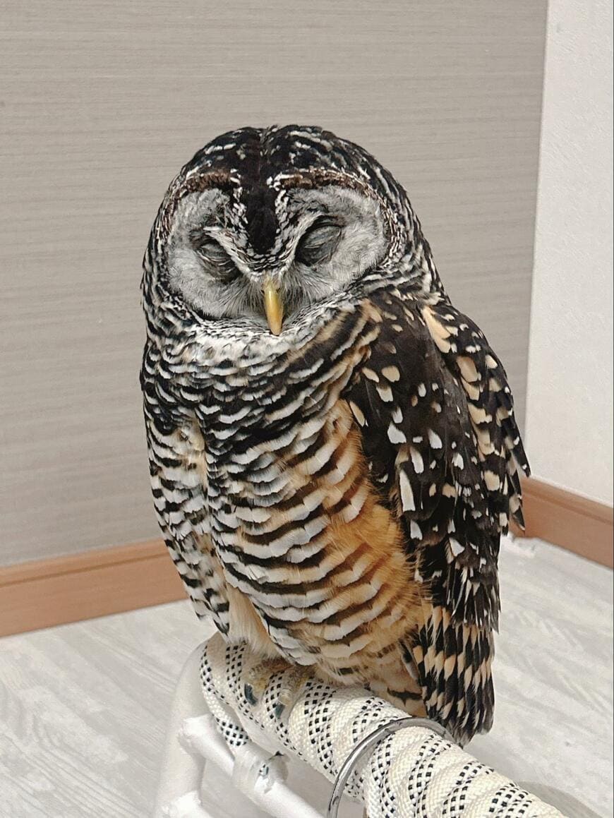 アカアシモリフクロウの「かなたちゃん」が、立ったまま眠る写真がXで話題です。投稿されたのは「@kanata_akas」さん。