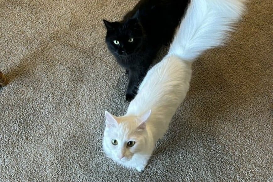 「おやつが手に入るまでこれが続く」そんなコメントとともに投稿されたのは1枚の写真でした。写っているのは2匹の猫ちゃんで、それぞれ白と黒のフサフサボディが印象的。