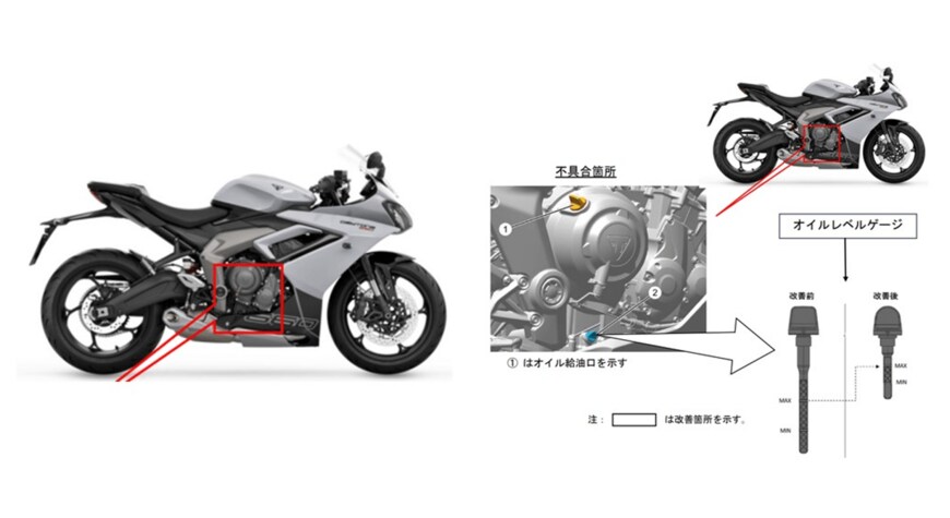 - 対応方法:全車両、エンジンオイルを追加し、オイルレベルゲージを対策品に交換する。エンジンを点検し、内部に損傷が発見された場合は、損傷状態に応じて交換する。また、取扱説明書の追補版を配布する