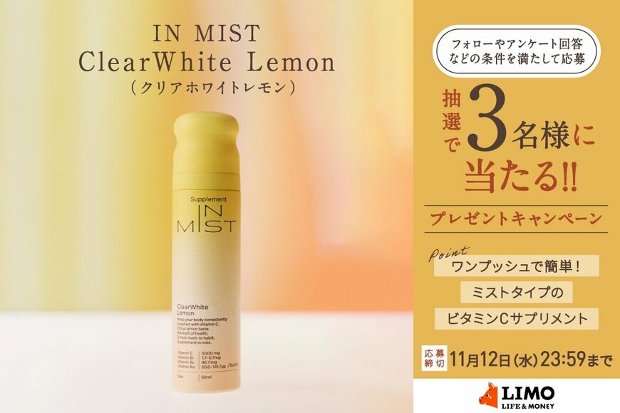 今回のキャンペーンでは条件を達成したユーザーから抽選で3名様にIN MIST(インミスト)「ClearWhite Lemon(クリアホワイトレモン)」をプレゼントします。応募条件は以下の通りです。