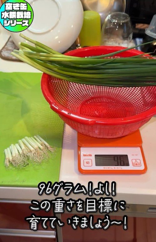 mikanbo-yaさんが準備した小ネギの可食部分は96g。この重さを目標に水耕栽培&検証スタートです!