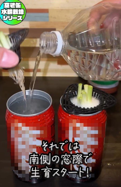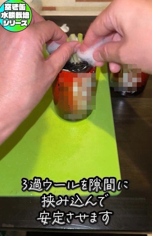 1.3 【小ネギの水耕栽培 2】水を入れた空き缶に乗せる