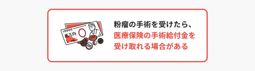 医療保険に加入している場合、粉瘤の手術で手術給付金を受け取れる可能性があります。粉瘤の手術は通常日帰りで行われるため、外来手術給付金の対象となるのが一般的です。