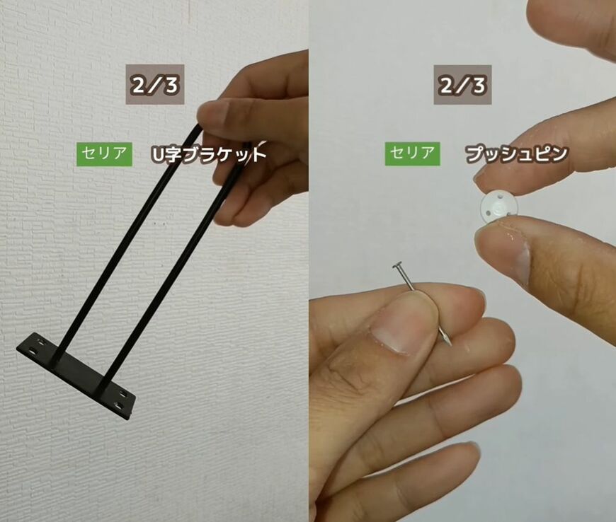 今回の動画では、100円均一ショップ「セリア」で購入できる「U字ブラケット」「プッシュピン」「木板」を使います。